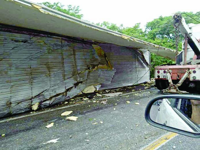 Iba cargado con papaya, procedente de Tapachula y tenía como destino el centro del país, cabe agregar que los paramédicos valoraron al chofer y dieron a conocer que no presentaba lesiones que pusieran en riesgo su vida. El accidente se registró, cuando frenó de golpe y la carga se le fue encima, arrancando el cabezal del tráiler.