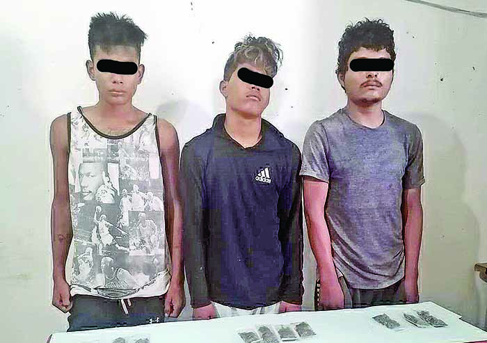 Al aplicarles una revisión de rutina, Ronaldo, (a) “El Rony” de 23 años, con domicilio en el Cantón La Unión, en la zona cañera de Huixtla, quien llevaba en su poder 3 bolsitas con marihuana y Jonathan (a) “El Chuquis”, de 18 años, con domicilio en el fraccionamiento Bellavista, que llevaba 4 bolsitas con mariguana quien fue detenido por segunda ocasión y Rodolfo (a) “El Role” de 19 años de edad, de la colonia Bellavista que le aseguraron 3 bolsitas de marihuana.