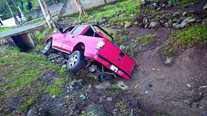 Tapachula, Chiapas; 06 de Septiembre.- Un raudo conductor de una camioneta particular Ford de color rojo, tipo Pick Up, con placas de circulación del estado de Chiapas, circulaba a exceso de velocidad de Viva México hacia Huehuetán, pero al llegar a la altura del Ejido Poste Rojo perdió el control de su camioneta y se proyecta sobre su costado derecho hasta terminar semivolcado dentro del canal del Dren Pluvial.