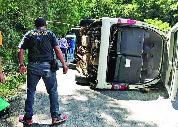 Comitán.-Con al menos cuatro personas lesionadas y cuantiosas pérdidas materiales, se saldó la volcadura de un vehículo de transporte público que circulaba sobre la carretera que comunica Altamirano con Comitán.
