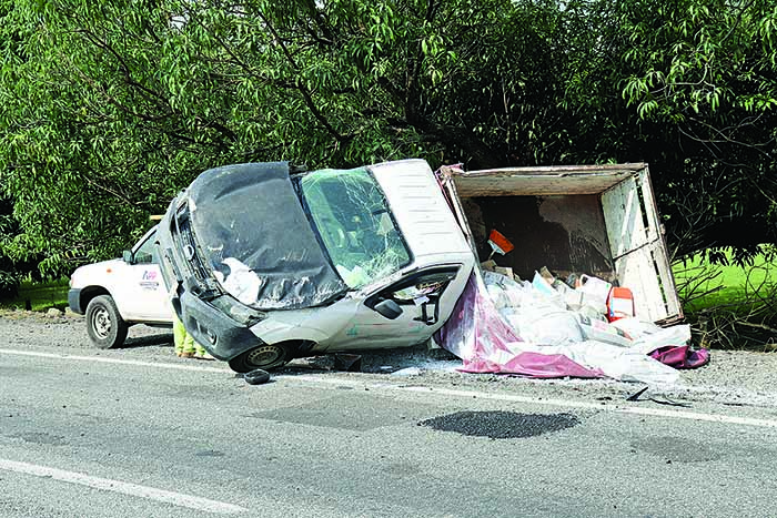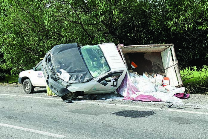Al parecer por la gravilla que estaban regando para reparar los baches de la carretera el conductor perdió el control de la unidad y termina volcado después de dar varias volteretas.
