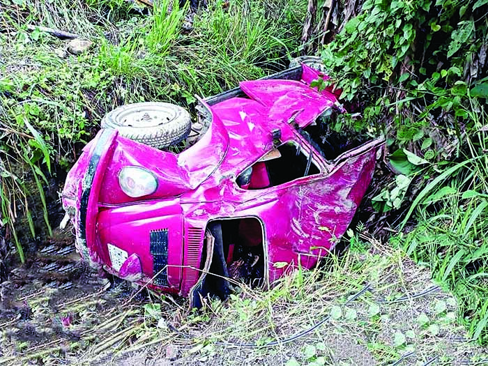Tecpatán, Chiapas.- Un automóvil terminó completamente destrozado tras salirse de la carretera y volcar, quedó en medio de la maleza en la vía que conecta a la comunidad Luis Espinosa y el poblado de Yomono.