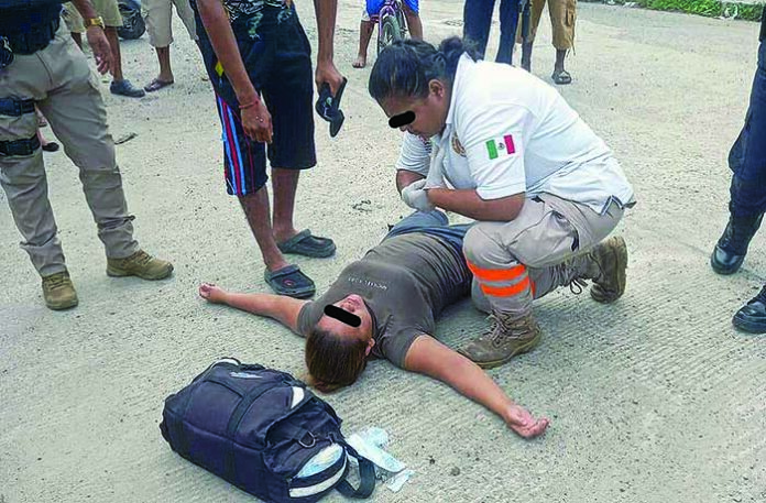 Suchiate, Chiapas; 15 de octubre.- Una joven que se desplazaban en una motocicleta, perdió el control de su vehículo, cuando fue golpeado por otra moto y la hizo caer a la cinta asfáltica. La dama fue auxiliada y valorada por paramédicos de Protección Civil Municipal.