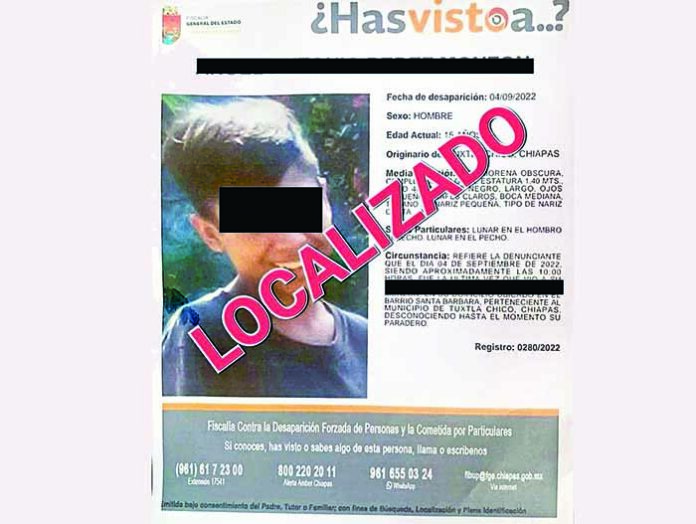 Durante los trabajos de búsqueda, elementos de la Policía de Investigación de la FGE obtuvieron resultados positivos, al ubicar al menor de 15 años de edad, sano y salvo en el mismo municipio de Tuxtla Chico. Derivado de las diligencias de investigación, la Fiscalía de Distrito determinó que el menor localizado, su integridad física nunca se encontró bajo ningún riesgo, por lo que ya se encuentra reincorporado al seno familiar. Boletín Oficial