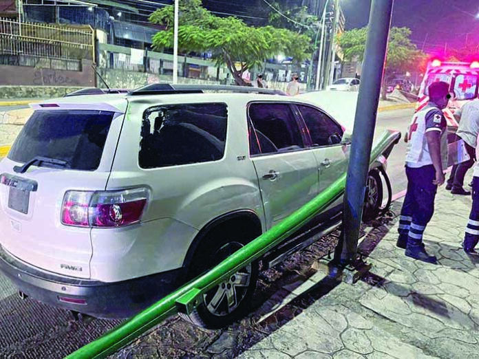 Alrededor de las 20:10 horas se dio el accidente de tránsito en donde informaron los agentes de Vialidad, que una camioneta GMC Acadia, circulaba a exceso de velocidad de oriente a poniente sobre la mencionada vía, cuando la conductora perdió el control y terminó impactada contra el poste de alumbrado público. Paramédicos de la Cruz Roja valoraron a las personas que viajaban en esta unidad. EL ORBE / Rafael Jiménez / Corresponsal