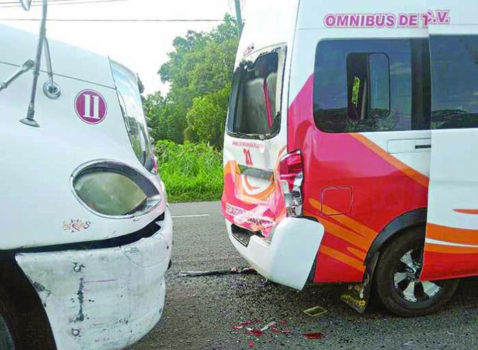 Alrededor de las 13:30 horas, el conductor de un Tráiler Freightliner, no guardó la distancia correspondiente y se impactó en la parte trasera de una colectiva Nissan Urvan de la ruta Ciudad Hidalgo – Tapachula con número económico 21; del fuerte impacto la colectiva chocó contra la parte trasera de una camioneta Renault Oroch de color blanco.
