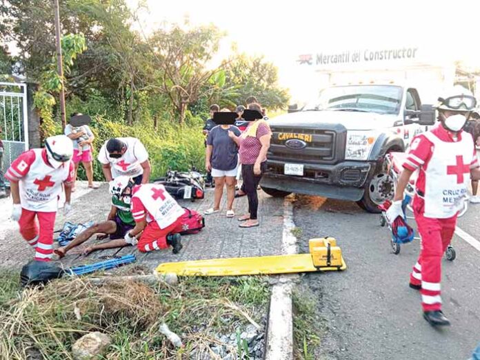 Tuxtla Chico, Chiapas; 15 de diciembre de 2022.- Con una probable fractura en la pierna izquierda resultó un joven conductor de una motocicleta Italika FT150 de color gris, luego de impactarse contra el costado derecho de un camión de reparto de materiales para la construcción. Los hechos se dieron en el Libramiento, a la altura de la Glorieta El Sacrificio, alrededor de las 17:20 horas, por lo que se activaron paramédicos de la Cruz Roja Mexicana quienes al llegar tuvieron encontraron a un joven lesionado en la pierna izquierda.