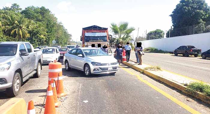 Tapachula, Chiapas; 29 de diciembre.- A la altura del retén del INM, que está en el ejido Viva México, se registró un accidente cuando un vehículo particular que circulaba de oriente a poniente sobre la carretera costera, al intentar incorporarse a la vía de circulación quiso rebasar en boca calle y causó corte de circulación a un camión que transitaba en el mismo sentido.