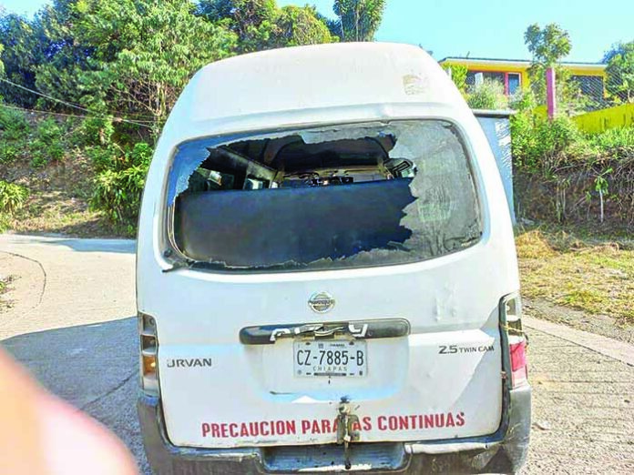 Tapachula, Chiapas; 11 de febrero.- Por pelear pasaje, una unidad colectiva fue apedreada por el conductor de otra unidad de la ruta de Tapachula a Galeras, en la zona media alta de Tapachula.