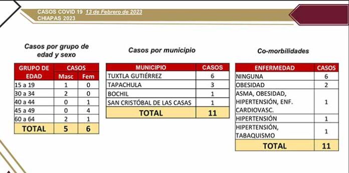 Tuxtla Gutiérrez, Chiapas; 13 de Febrero de 2023.- La Secretaría de Salud del Estado dio a conocer 11 casos nuevos de COVID-19 en la entidad: seis en Tuxtla Gutiérrez, tres en Tapachula, así como un caso en Bochil y San Cristóbal de Las Casas; sin registro de defunciones por esta enfermedad respiratoria.