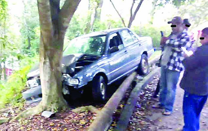 Tecpatán, Chiapas; 24 de febrero.- El conductor de un automóvil perdió el control y terminó fuera de la vía, en la curva cerca de la secundaria técnica número 33. El vehículo se estrelló contra un árbol quedando con cuantiosos daños materiales, por lo que fue reportado por los automovilistas.