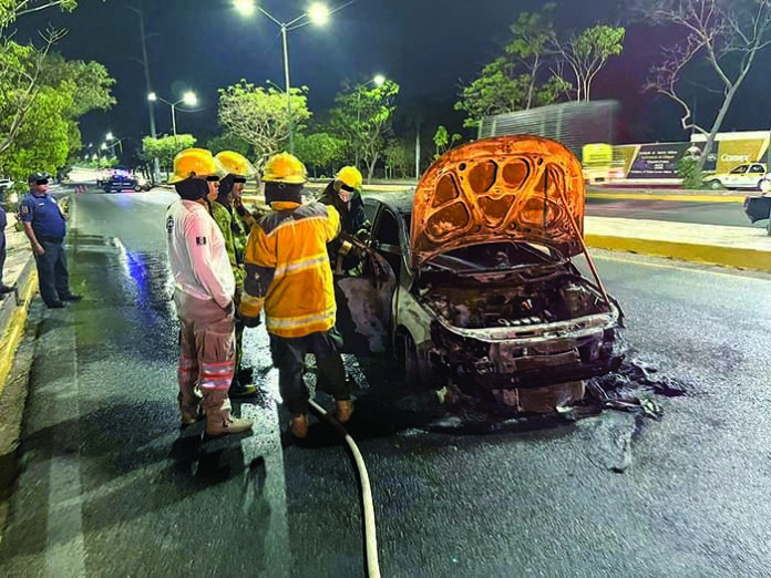 Tuxtla Gutiérrez, Chiapas; 4 de marzo.- Un vehículo se incendió en los primeros minutos de este sábado, cuando se impactó contra la jardinera central del libramiento Norte Oriente a la altura de la colonia Los Manguitos, al norte oriente de la capital, chiapaneca. Al parecer el siniestro se debió a un cortocircuito.