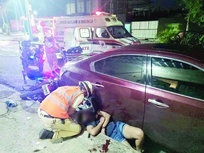 Tapachula, Chiapas; 11 de junio.- Un fuerte choque se registró a la altura de la 2ª calle oriente entre 9ª y 7ª avenida sur, de la colonia Centro, se estrellaron dos personas que viajaban en una motocicleta, contra un carro que estaba estacionado.