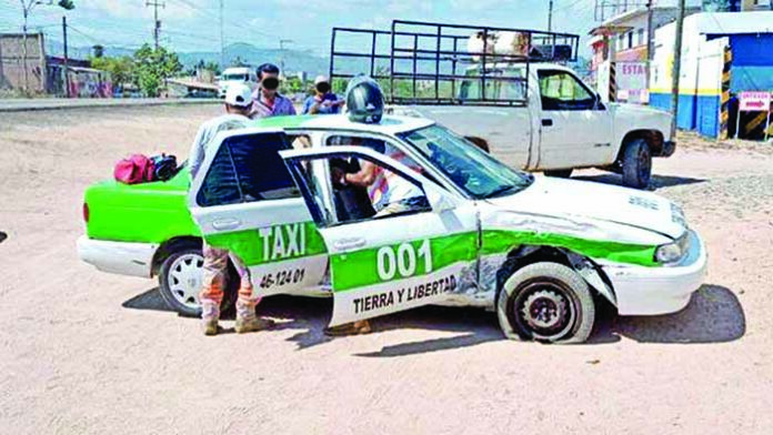La unidad de transporte público tenía averiada la salpicadera derecha y reventada la llanta delantera del mismo lado, junto a este vehículo estaba en una camioneta Ford de color blanco que tenía daños en la parte frontal izquierda. Los elementos de la Guardia Nacional se encargaron de lo sucedido. EL ORBE / Rafael Jiménez / Corresponsal