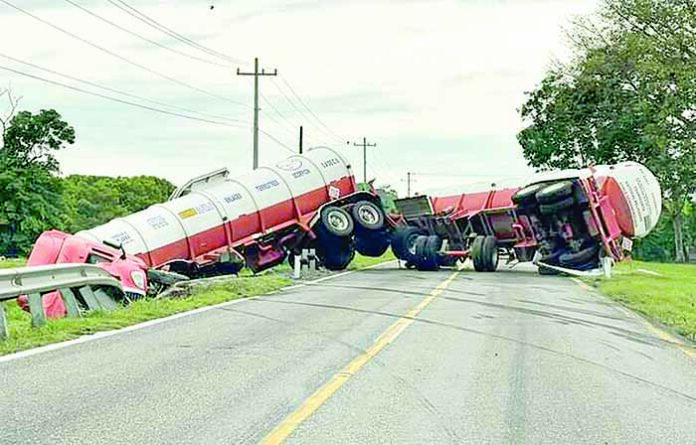 Elementos de la Policía Municipal y Estatal Preventiva, acudieron al sitio y encontraron un tráiler de doble pipa volcado.