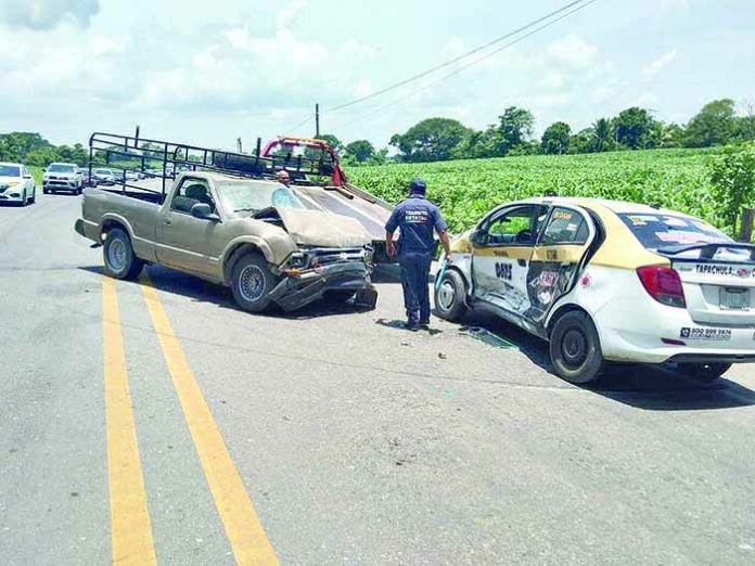 Dejó como saldo cinco personas lesionadas, además de una camioneta tipo Pick up y un taxi local dañados. Elementos policiacos y de rescate, brindaron los primeros auxilios a Sheila “N” de 30 años de edad, que a la revisión presenta dolor en cervicales, columna y cadera; fue llevada al Hospital General de Tapachula.