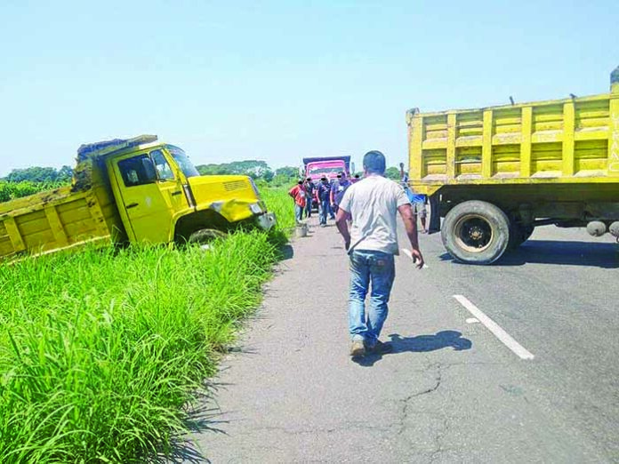 Metapa de Domínguez, Chiapas; 14 de julio.- El conductor de un camión de volteo, sufrió un accidente cuando se orilló al lado derecho para tomar una llamada, pero se desgajó la calle.