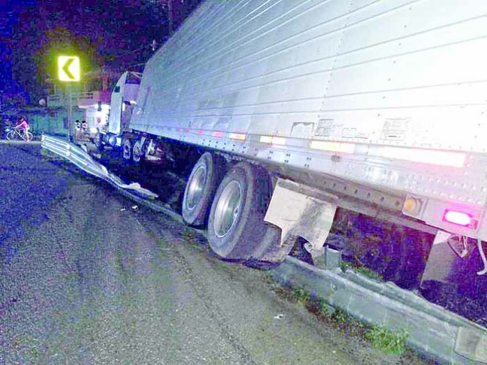 Frontera Hidalgo, Chiapas; 17 de julio.- Aproximadamente a las 18:50 horas, se registró un accidente automovilístico a la altura del kilómetro 20+250, cuando el conductor de un Kenworth de color blanco, propiedad de transportes LJRM del Distrito Federal, remolcaba una caja seca cerrada, con placas del Servicio Público Federal y conducido por Gabriel “N” de 31 años de edad, originario del Estado de México; iba con destino hacia Suchiate y el chofer perdió el control, dañó 11 postes, 11 separadores y 7 bandas metálicas, además de una luminaria completa.