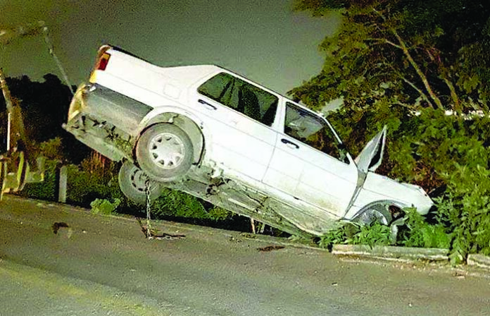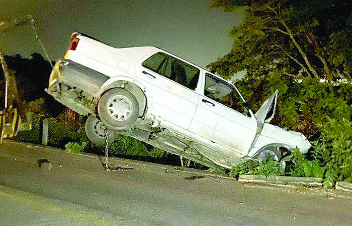 El percance sucedió a la altura del lugar conocido como el desvío de la Cruz, en donde de acuerdo al conductor de un Volkswagen Jetta de color blanco, perdió el control luego de que un motociclista invadiera su carril y para evitar el choque decidió salir de la cinta asfáltica y colisionó contra unas piedras. Tras el aparatoso impacto, el chofer y dos de sus acompañantes resultaron con lesiones por lo que fueron auxiliados por pobladores quienes inmediatamente pidieron ayuda al 911.