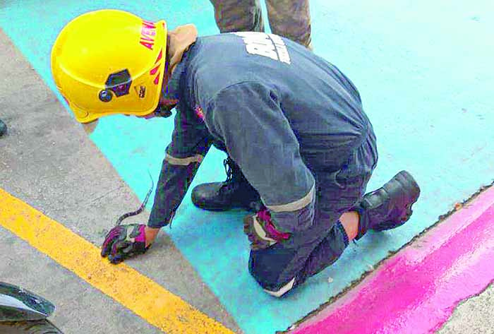Tuxtla Gutiérrez.-La tarde de este lunes, elementos del Cuerpo de Bomberos llevaron a cabo la captura de una serpiente en el estacionamiento de Plaza del Sol, en la capital chiapaneca.