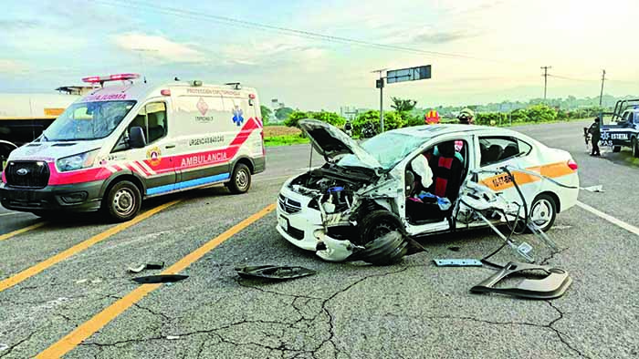 Tapachula, Chiapas; 24 de Julio.- Un imprudente trailero ocasionó un fuerte accidente automovilístico al realizar corte de circulación y golpear a un taxi.