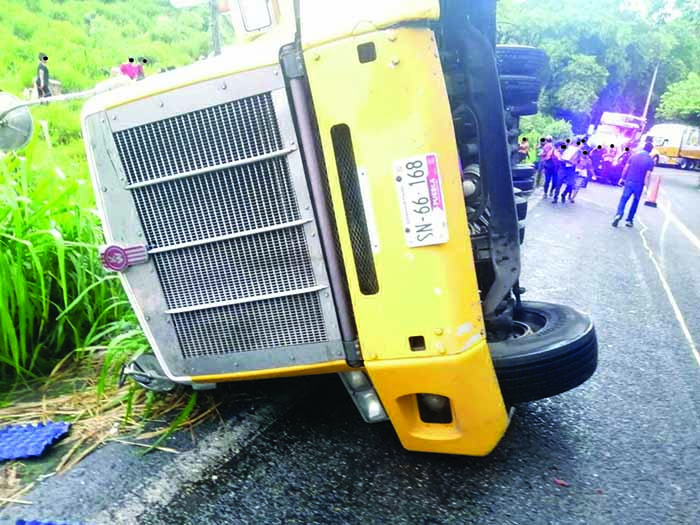 Tuzantán, Chiapas; 28 de Julio.- Conductores que transitaban sobre el tramo Huixtla- Motozintla, frente al Rancho Rosita, se percataron que un tráiler se había volcado sobre su costado derecho.