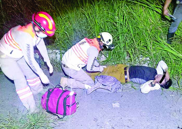 Paramédicos de Protección Civil al llegar al lugar pudieron apreciar a una persona del sexo masculino de nombre Santiago «N» de 30 años de edad, quien se encontraba sentado a un lado de la carpeta asfáltica y presentaba una seria lesión a la altura de la pierna derecha.