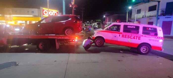 Tapachula, Chiapas; 20 de Agosto de 2023.- Conductores y habitantes aledaños a la 7ª Avenida Norte y 9ª Calle Oriente, reportaron al 911 Emergencias C-5 Escudo Urbano de Tapachula un accidente vehicular en el cual están involucrados una ambulancia del Grupo SAE y un vehículo particular.