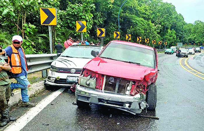 Vialidad Municipal de Tapachula y Tránsito, serían los encargados de deslindar las responsabilidades, y dieron a conocer que el conductor responsable manejaba un Chevrolet Silverado de color rojo, Alberto “N” de 25 años de edad, originario de Tuxtla Chico y transitaba de Tapachula a Tuxtla Chico, al circular a exceso de velocidad, derrapó en la curva, invadió el carril contrario y fue golpeado por una camioneta Chevrolet Colorado Pick up, que era conducida por Mario “N” de 27 años de edad, originario de Guatemala y transitaba de Tuxtla Chico a Tapachula. Al impactarse perdió el control y volante hacia la derecha, le pegó a un Volkswagen Jetta conducido por José Yair “N” de 42 años de edad. EL ORBE / Roberto Corado Mosqueda