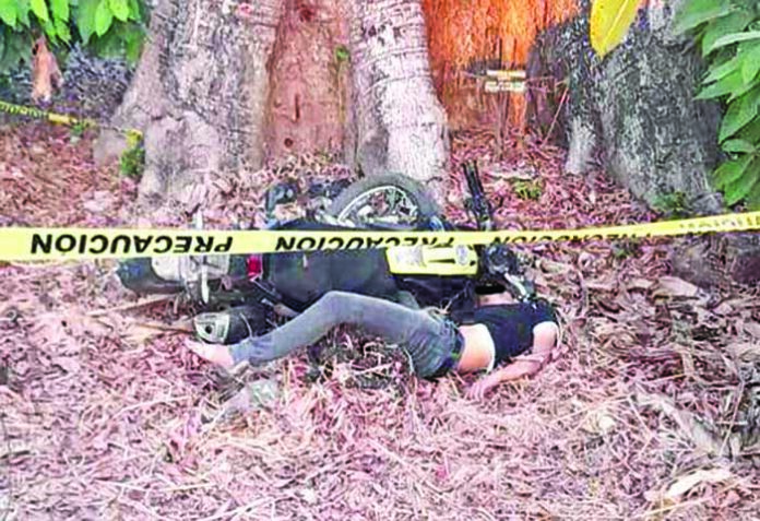 Acapetahua; Chiapas; 7 de enero.- Conductores que transitaban sobre el tramo carretero que conduce de la cabecera municipal hacia el ejido Madronal, a la altura de la curva La Pochota, se percataron que fuera de la carpeta asfáltica se encontraba un motociclista estrellado contra un árbol de ceiba.