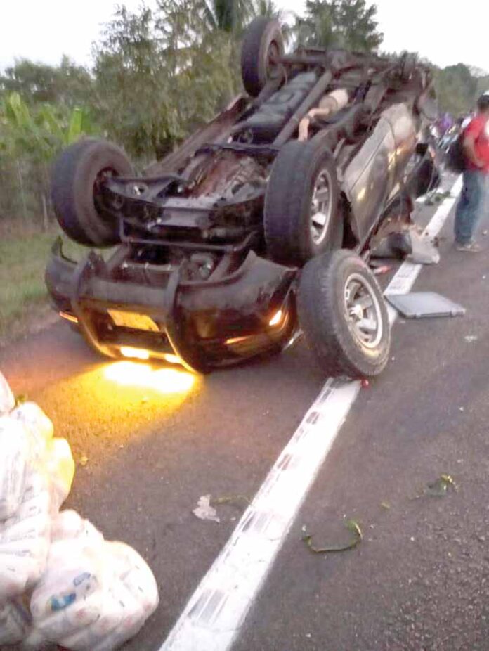 Los elementos policiacos pidieron la intervención de Tránsito del Estado y de la policía de la Guardia Nacional División Caminos, para las diligencias correspondientes de este accidente. Los uniformados señalaron que la camioneta responsable y accidentada es la Ford Ranger que manejaba Miguel Alejandro, iba de Tapachula a Villa Comaltitlán y al llegar al sitio mencionado se estrelló y dañó aproximadamente 12 metros de las barras metálicas de protección, hasta terminar volcado. EL ORBE / Roberto Corado Mosqueda