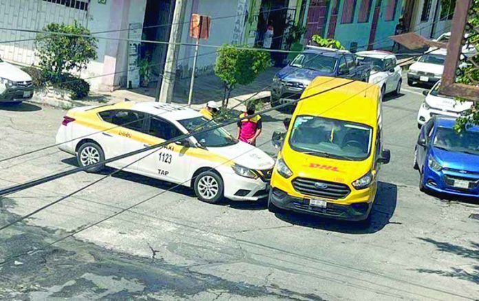 Tapachula, Chiapas; 24 de febrero.- Daños materiales fue el resultado de un accidente automovilístico, que causó el conductor de una empresa de paquetería que circulaba de poniente a oriente sobre la 10ª calle oriente y al llegar al cruce con la 1ª avenida sur, no respetó la vía de preferencia y fue golpeada en el costado derecho delantero por un taxi local de número 1123.