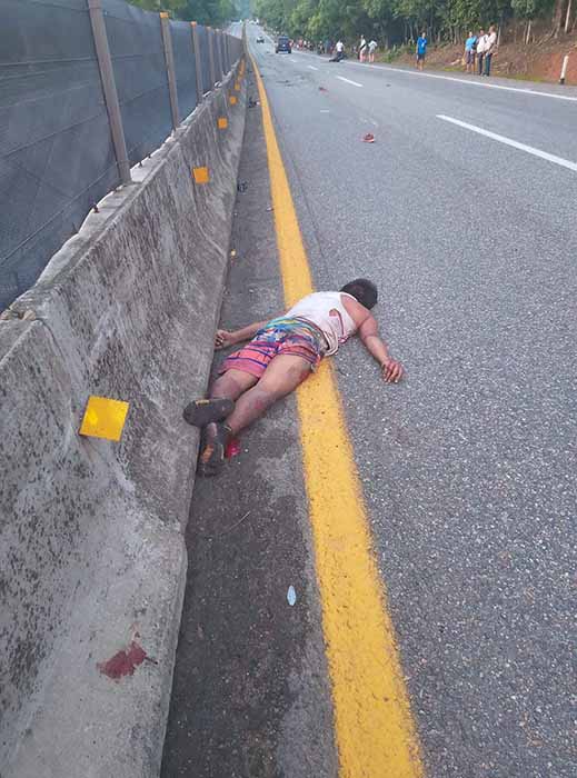 Huehuetán, Chiapas; 06 de Junio.- Conductores que transitaban sobre el tramo Tapachula – Huixtla, reportaron que la altura del cantón Cuntalapa, kilómetro 265+650, del municipio de Huehuetán, un tractocamión de color azul había arrollado a una persona que se desplazaba en motocicleta, que había sido arrastrado varios metros, quedando tirada inconsciente sobre el carril de alta velocidad pegado a los muros de divisorios de carriles.