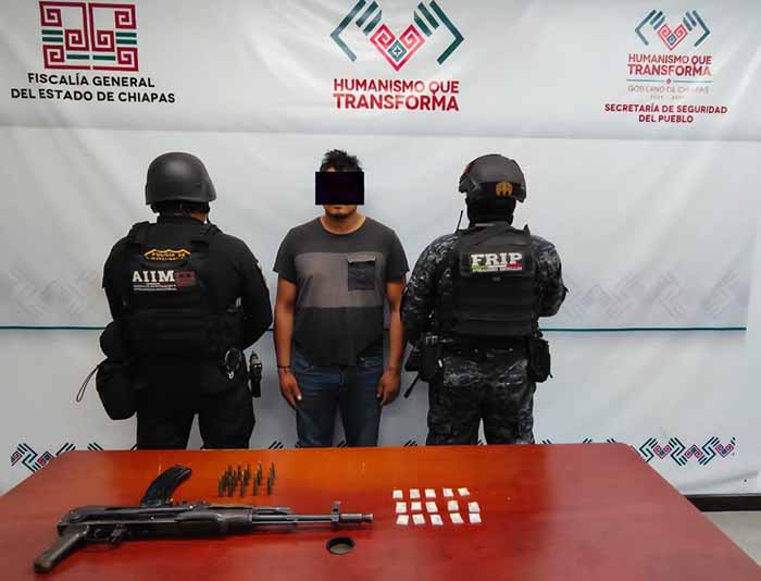 En operativo interinstitucional, la Secretaría de Seguridad del Pueblo (SSP) a través de la Fuerza de Reacción Inmediata Pakal (FRIP) en coordinación con la Agencia de Investigación e Inteligencia Ministerial (AIIM) de la Fiscalía General del Estado (FGE) y la Secretaría de Seguridad y Protección Ciudadana (SSPC) del Gobierno Federal, detuvieron a una persona del sexo masculino por portación de arma de fuego de uso exclusivo de las fuerzas armadas y presuntos narcóticos en Cintalapa de Figueroa.