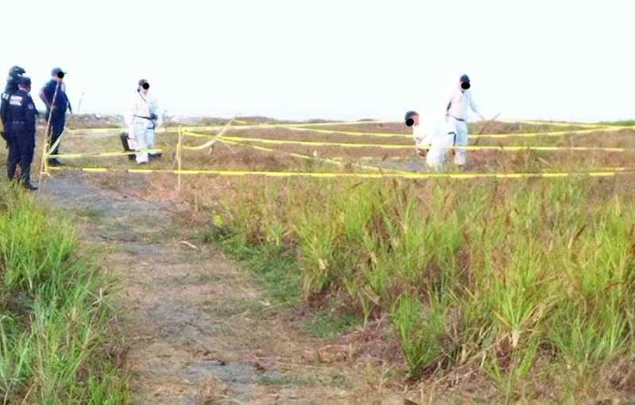 Aproximadamente a las 07:00 horas, acudió Servicios Periciales de la Fiscalía General de Justicia del Estado (FGJE), encabezado por el perito en criminalística de campo y después de realizar las excavaciones y el peritaje correspondiente, se confirmó que se encontraban en un avanzado estado de putrefacción y gran parte reducidos a osamenta.