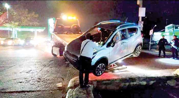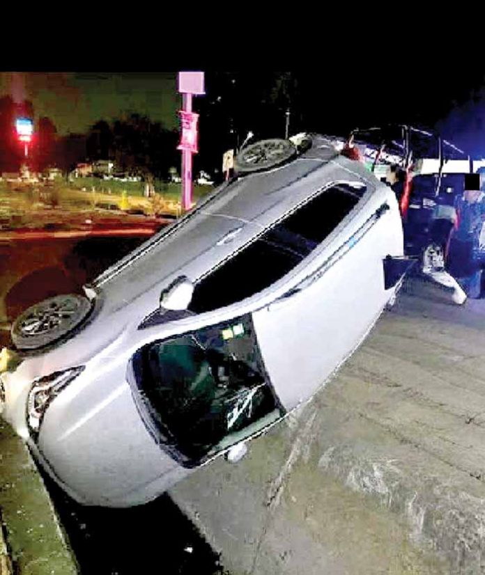 Tapachula, Chiapas; 19 de febrero.- La falta de precaución y las maniobras peligrosas en el retorno frente a Plaza Galerías, entre la 7ª y 9ª avenida sur par vial, provocaron un aparatoso accidente, cuando un vehículo compacto terminó en el fondo del dren pluvial, movilizando a los cuerpos de emergencia.