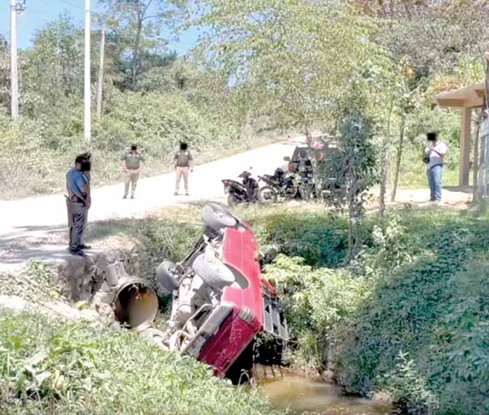 Palenque, Chiapas; 11 de marzo.- Cuantiosas pérdidas materiales, es el saldo que dejó la volcadura de una camioneta, cuyo conductor perdió el control y cayó a un canal pluvial, sobre la carretera a Pakal-Ná.