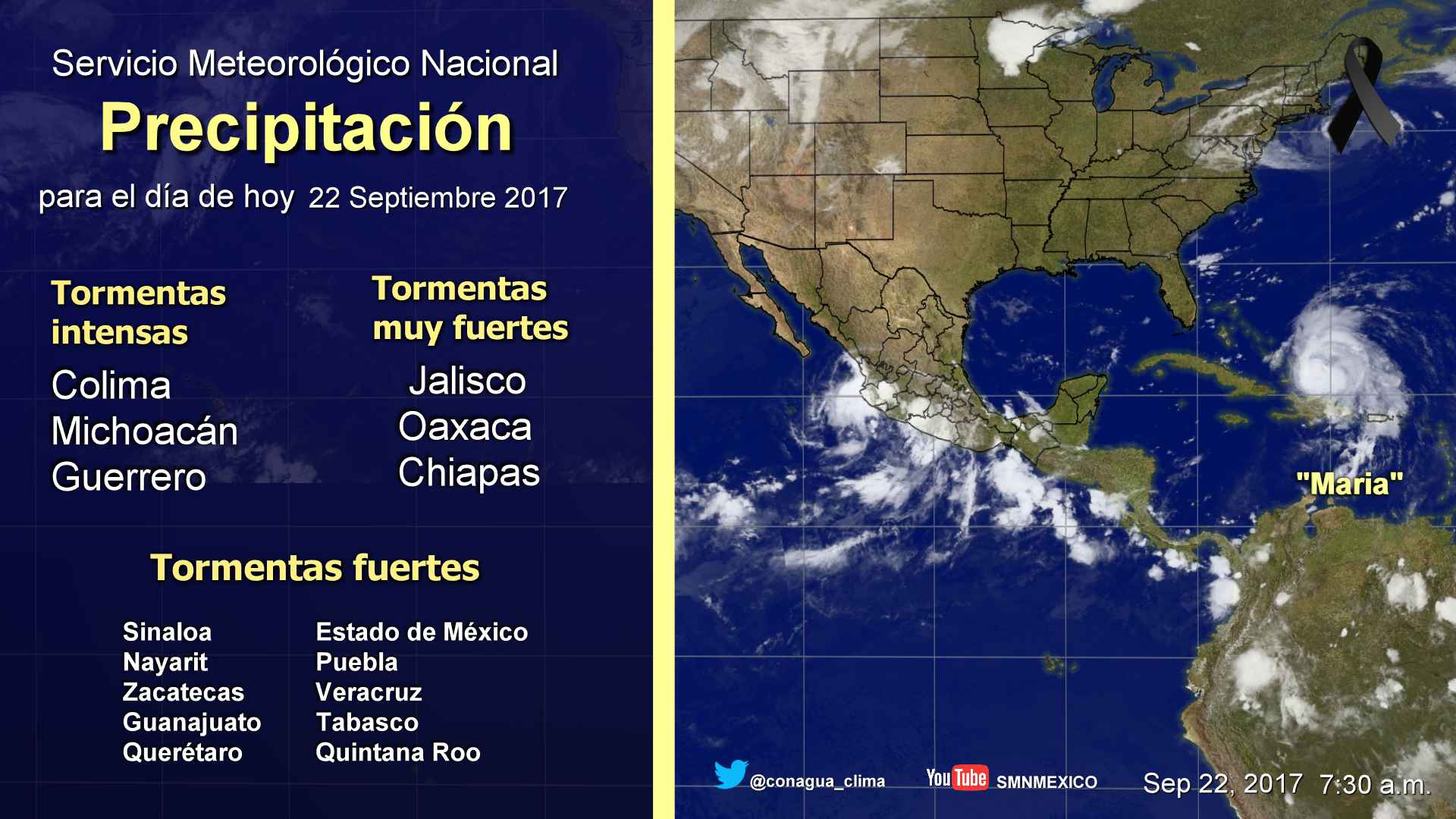 Para las próximas horas se pronostican tormentas intensas en sitios de Colima, Michoacán y Guerrero; tormentas muy fuertes en zonas de Jalisco, Oaxaca y Chiapas, y tormentas fuertes en regiones de Sinaloa, Nayarit, Zacatecas, Guanajuato, Querétaro, Estado de México, Puebla, Veracruz, Tabasco y Quintana Roo.