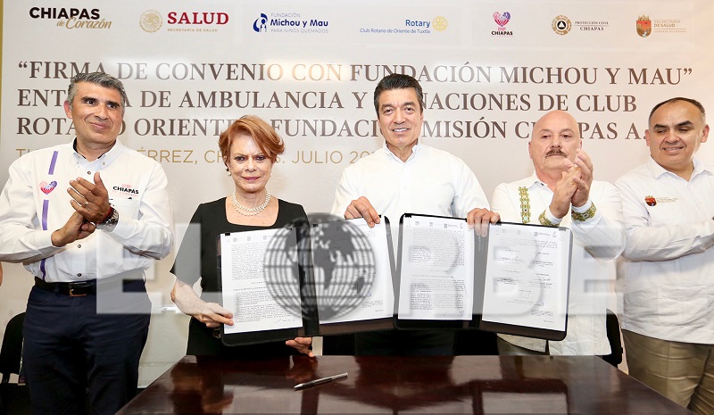 Tras atestiguar la firma del convenio de colaboración entre la Presidenta de la Fundación Michou y Mau y los secretarios de Salud, José Manuel Cruz Castellanos; de Protección Civil, Luis Manuel García Moreno y el director del DIF Chiapas, Ángel Carlos Torres Culebro, el mandatario señaló que Chiapas requiere de la beneficencia que diferentes organizaciones y fundaciones realizan, y reiteró el ánimo de su Gobierno para aportar y trabajar juntos, sobre todo a favor de la salud.