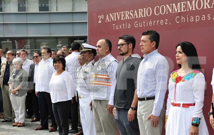 En el marco de la conmemoración del segundo aniversario del sismo del 7 Septiembre del 2017, el gobernador Rutilio Escandón Cadenas, encabezó el izamiento de la bandera nacional a media asta, en señal de luto, y acompañó al secretario de Desarrollo Agrario, Territorial y Urbano, Román Guillermo Meyer Falcón, en la presentación del balance de los avances y metas del Programa Nacional de Reconstrucción en Chiapas.