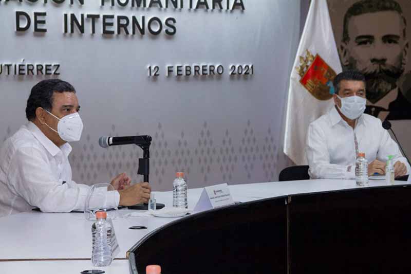 Tuxtla Gutiérrez, Chiapas. 12 de febrero 2021.- Como parte de los trabajos de la Mesa de Reconciliación, el magistrado presidente Juan Óscar Trinidad Palacios, acompañó al gobernador Rutilio Escandón Cadenas durante la Liberación Humanitaria de Internos efectuada, dentro de los protocolos de sanidad, en las instalaciones de Palacio de Gobierno.