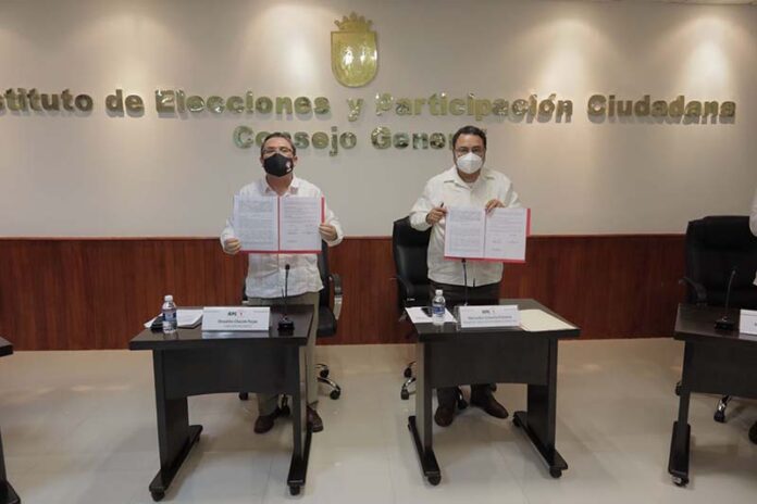 Tuxtla Gutiérrez.- El Instituto de Elecciones y Participación Ciudadana (IEPC) de Chiapas y Consejo Estatal de Notarios del Estado llevaron a cabo la firma del Convenio de apoyo y colaboración con la finalidad de otorgar el servicio notarial necesario durante el Proceso Electoral Local Ordinario 2021, especialmente durante la Jornada Electoral del 6 de junio. Por parte del IEPC, signó el convenio el consejero presidente Oswaldo Chacón Rojas, mientras que, por el Consejo de Notarios, fue su presidente, Wenceslao Camacho Pimienta.