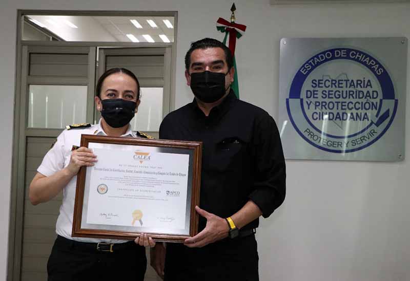 Tuxtla Gutiérrez, Chiapas.- La secretaria de Seguridad y Protección Ciudadana, Gabriela Zepeda Soto, recibió de la Comisión de Acreditación de Aplicación de la Ley (Calea), el certificado de acreditación de la Dirección Estatal de Coordinación, Control, Comando, Comunicación y Cómputo C5, luego de cumplir con los procesos y estándares internacionales de calidad.
