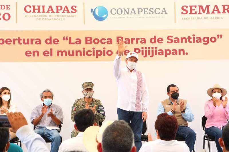 Tuxtla Gutiérrez.- Al presenciar la apertura de la Bocabarra de Santiago, en la comunidad La Conquista, del municipio de Pijijiapan, el gobernador Rutilio Escandón Cadenas subrayó que además de cumplir una añeja demanda de las mujeres y los hombres pescadores, con esta obra se contribuye al óptimo aprovechamiento de los sistemas lagunarios para fortalecer la producción pesquera, la cual representa una de las actividades económicas más importantes de las región.