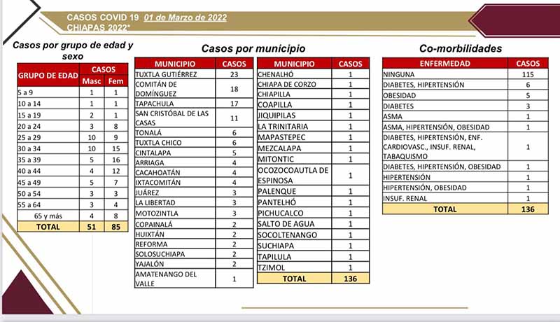 Tuxtla Gutiérrez, Chiapas; 01 de Marzo de 2022.- El informe diario sobre el comportamiento del COVID-19 en Chiapas indica que en las últimas horas se registraron 136 casos, la mayoría de ellos en personas en el rango de edad de 25 a 44 años, comunica la Secretaría de Salud del Estado.