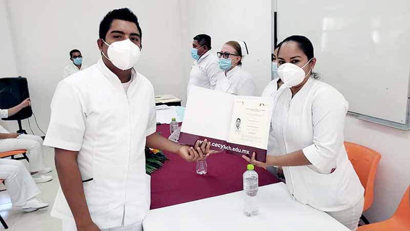 Directivos y académicos del Colegio de Estudios Científicos y Tecnológicos del Estado de Chiapas (Cecyte Chiapas), ubicado en el municipio de Acapetahua, realizaron la entrega de 58 títulos profesionales a egresados de la especialidad técnica en Enfermería general.