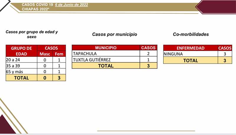 Tuxtla Gutiérrez, Chiapas; 06 de junio del 2022.- La Secretaría de Salud del estado informó que, en las últimas 24 horas, Chiapas reportó tres casos nuevos de COVID-19 en los municipios de Tapachula (2) y Tuxtla Gutiérrez (1), sumando 76 días consecutivos sin registrar muertes por esta enfermedad.