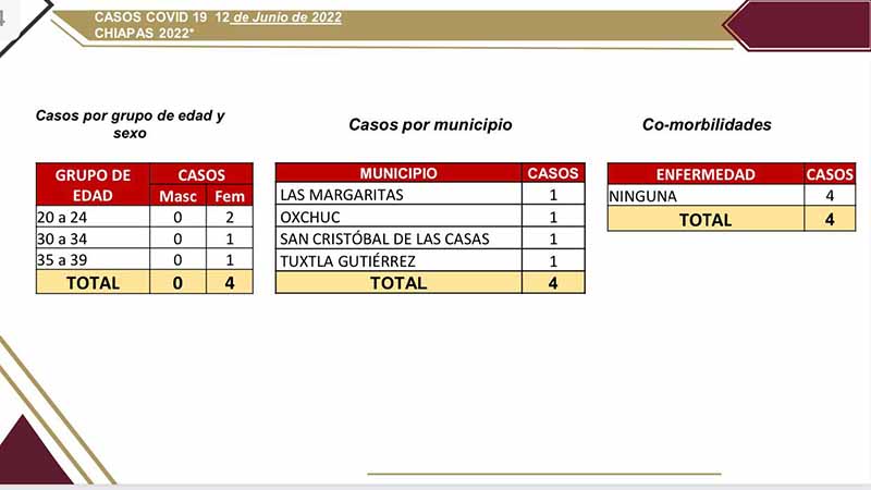 La dependencia estatal informó que los casos positivos recayeron en cuatro personas del sexo femenino, en diferentes rangos de edad: dos mujeres de 20 a 24 años y las otras dos mujeres de 30 a 39 años; los cuatro casos sin padecer ninguna comorbilidad.