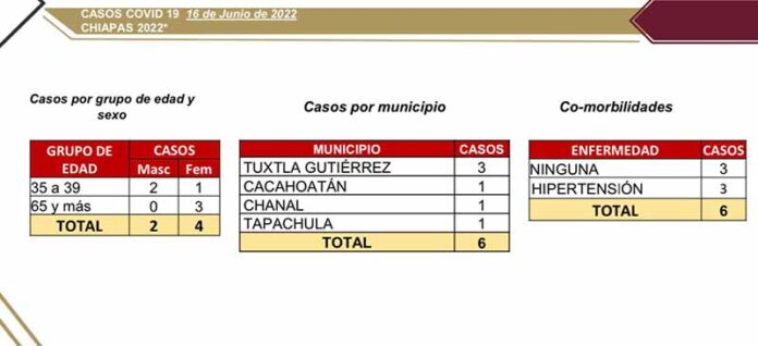 Tuxtla Gutiérrez, Chiapas; 16 de Junio del 2022.- De acuerdo al último corte del panorama epidemiológico de COVID-19, la entidad chiapaneca reportó seis casos nuevos en los municipios de Tuxtla Gutiérrez (3), Cacahoatán (1), Chanal (1) y Tapachula (1), sin registro de fallecimientos por esta enfermedad respiratoria.
