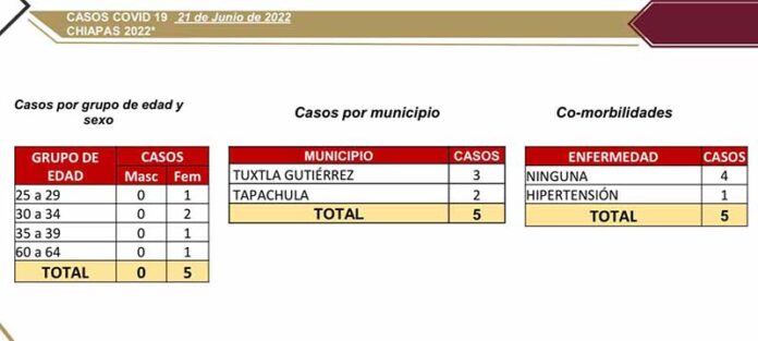 Tuxtla Gutiérrez, Chiapas; 21 de junio del 2022.- Chiapas registró cinco casos nuevos de COVID-19 en las últimas 24 horas, tres en Tuxtla Gutiérrez y dos en Tapachula, sumando un día más sin reporte de defunciones por esta enfermedad respiratoria, dio a conocer la Secretaría de Salud del estado.